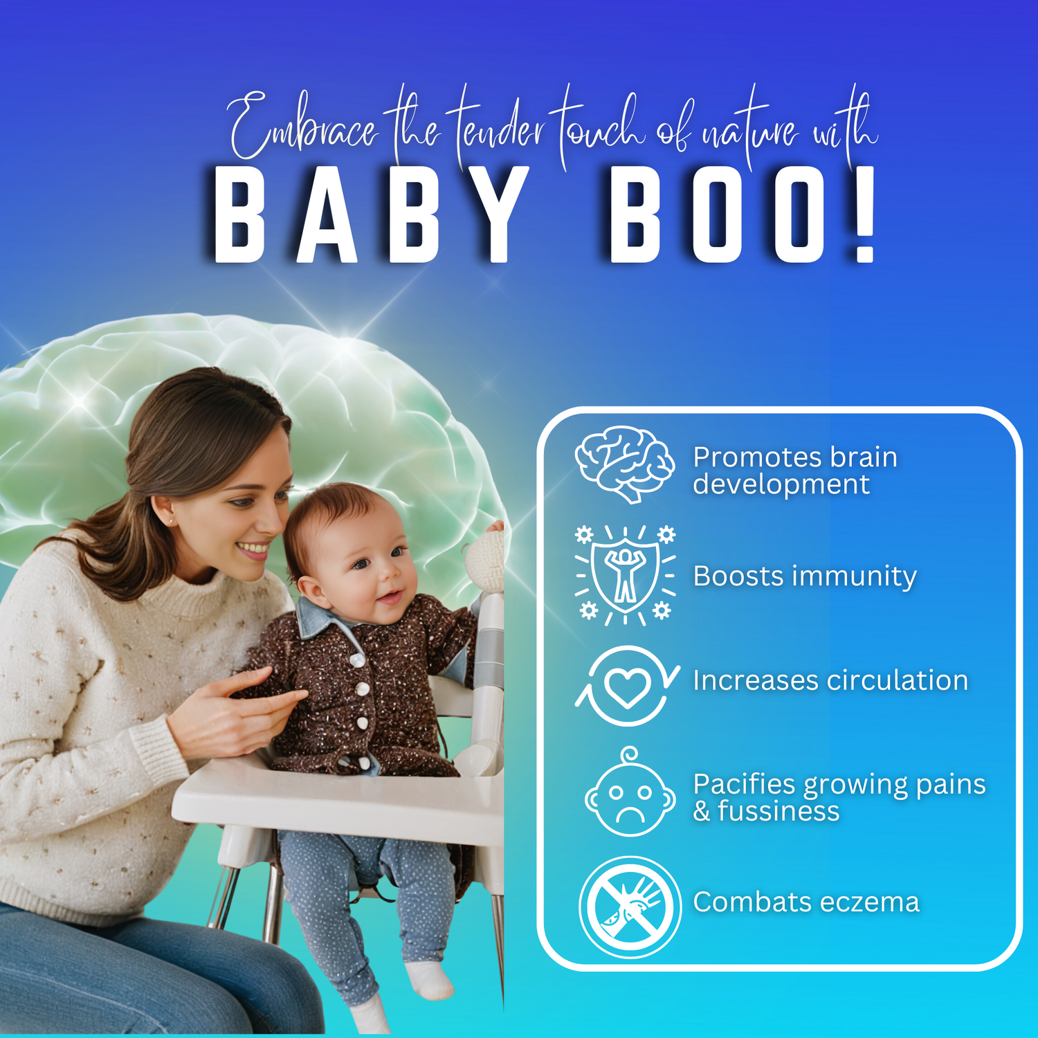 Baby Boo, the ultimate everyday massage oil designed specifically for the tender skin of babies aged 3 months and older. This gentle formula ensures a safe and comforting experience for your little one. Baby Boo boosts immunity, induces sleep, increases circulation, pacifies growing pains and fussiness, relieves flu symptoms, cough, cold, and congestion. Not to mention it soothes eczema too! This blend contains Frankincense, excellent for baby's brain development.