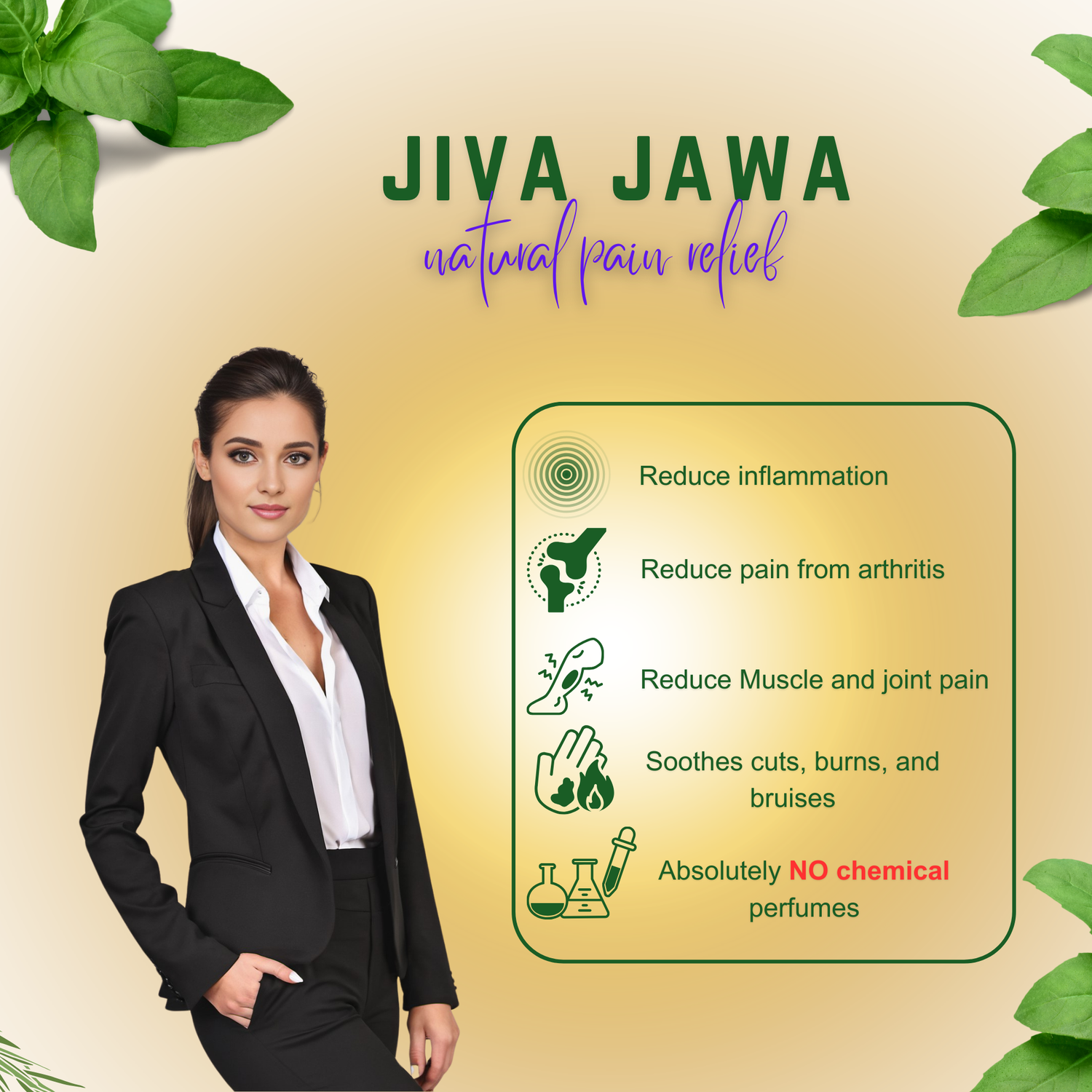 Jiva Jawa Healing Oil is a blend that works in harmony to soothe the skin, reducing inflammation, muscle and joint pain, a natural safe solution for managing chronic pain, cuts, burns, bruises, and arthritis.